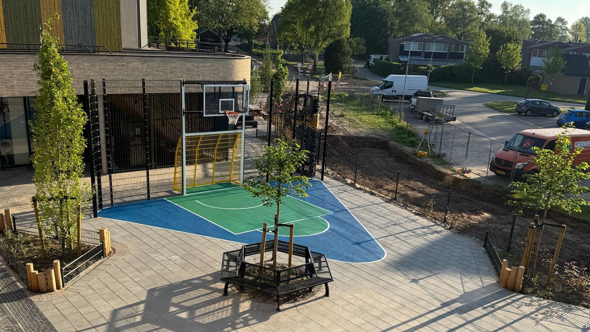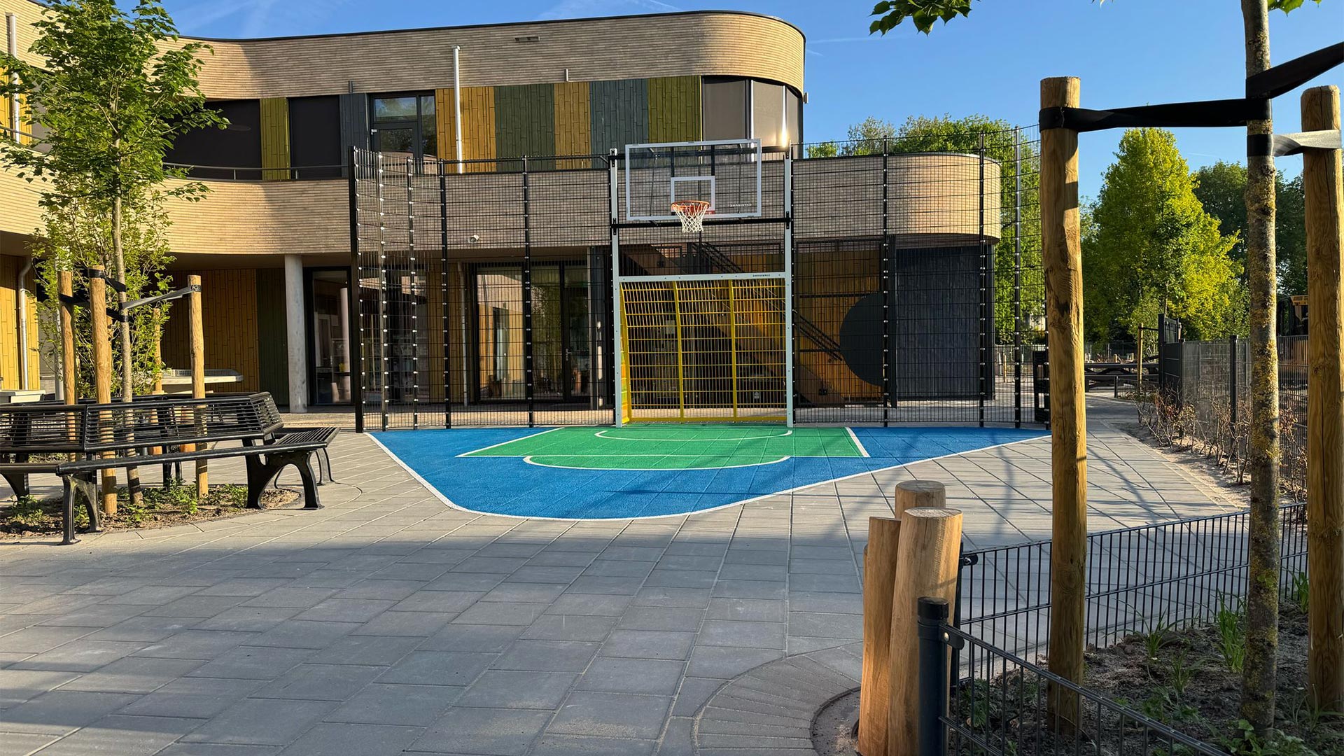 Ook de ondergrond hebben wij volledig verzorgd: de pleintegels zijn afgewerkt met een duurzame, kleurige coating inclusief duidelijke voetbal- en basketbalbelijning.